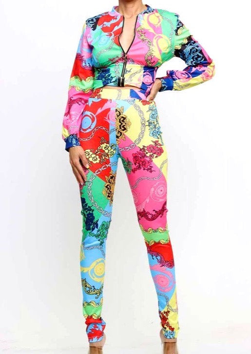 Multicolored Set Features Crop Zip Up Long Sleeve Puff Sleeve Jacket and Matching Stretch High Waist Leggings